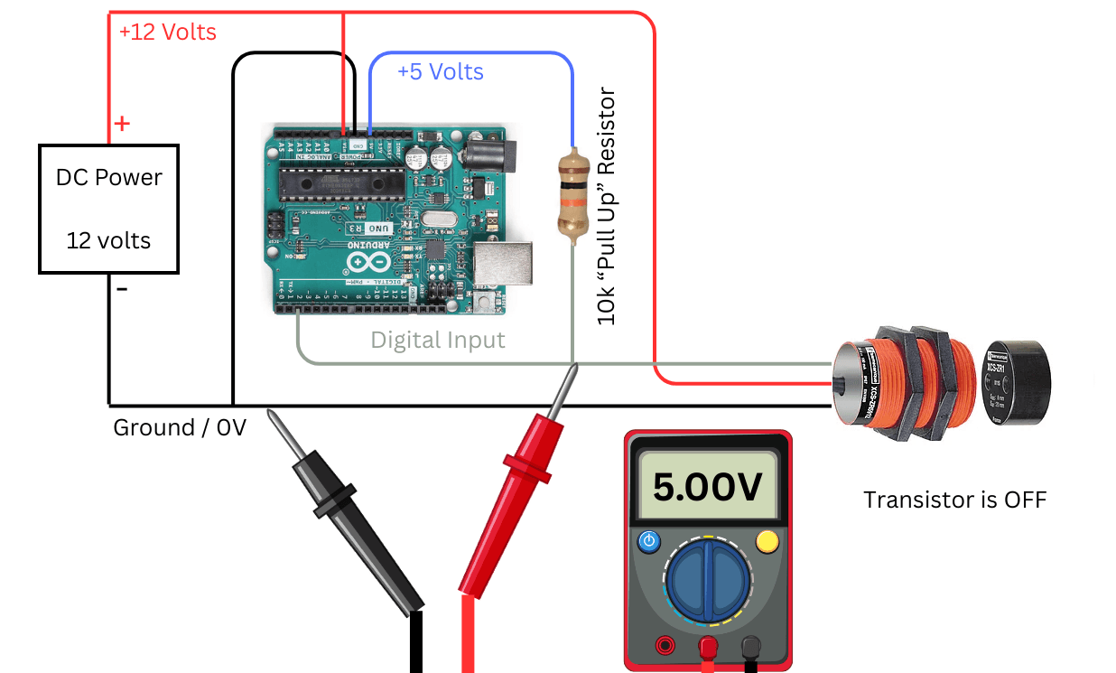 - Когда датчик неактивен (Transistor OFF), резистор подтягивает линию к 5V → контроллер читает «1». Так мы защищаем вход контроллера (Digital Input) от высокого напряжения датчика.