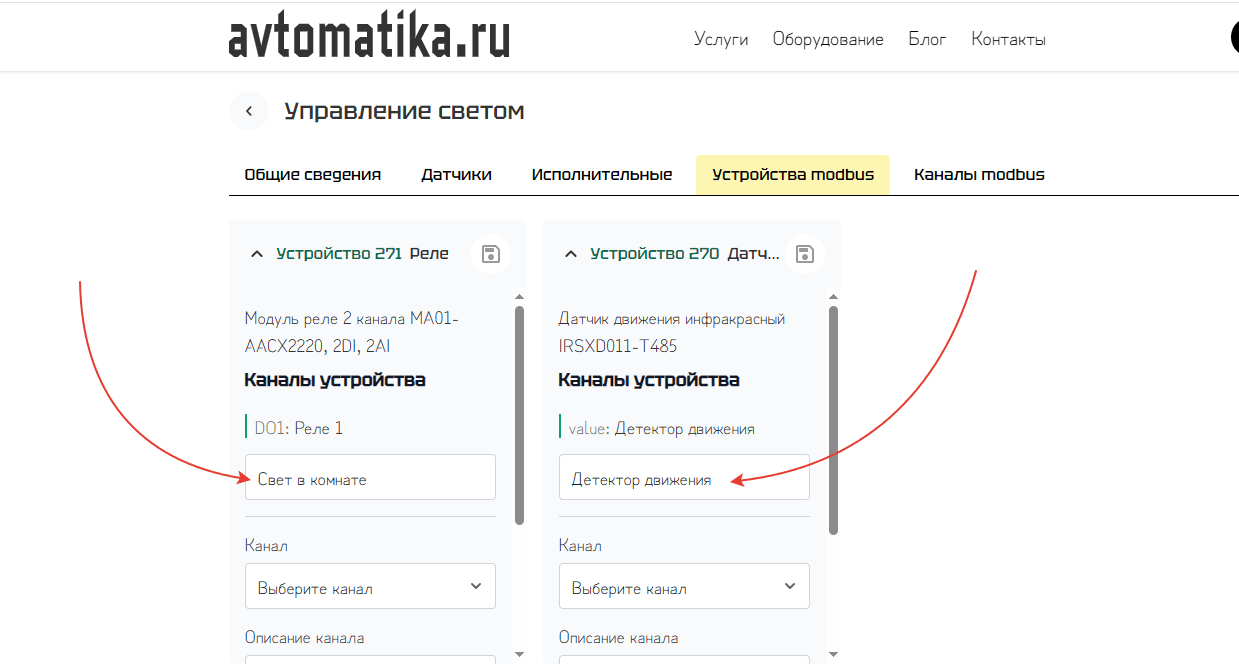 В этом уроке расскажем о том, как наши устройства попадают в Home Assistant. Перейдём в наш проект «Управление светом», вкладка «Устройства Modbus». Мы добавили в наш проект два устройства. При добавлении датчика движения мы указали, что информационный канал, отвечающий за детекцию движения, называется «Детектор движения». В модуле реле из двух каналов мы задействовали один информационный канал и назвали его «Свет в комнате». Мы могли бы добавить ещё один канал и назвать его как-то иначе, если бы нам это потребовалось. Когда это будет нужно, мы так и сделаем.