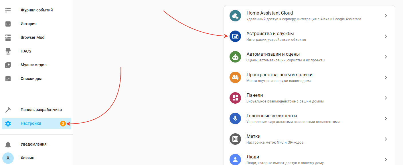 Задаём имя пользователя master, пароль — набор цифр от 1 до 8. Следует иметь ввиду, что в обязательном порядке, после того как вы зашли в Home Assistant, на пользователя master обязательно нужно поменять пароль. В Home Assistant заходим в «Настройки», затем выбираем «Устройства и службы», где перечислены интеграции, устройства и объекты.