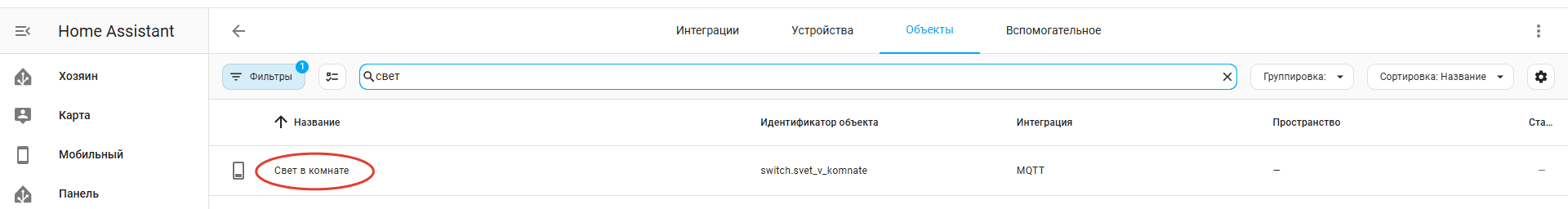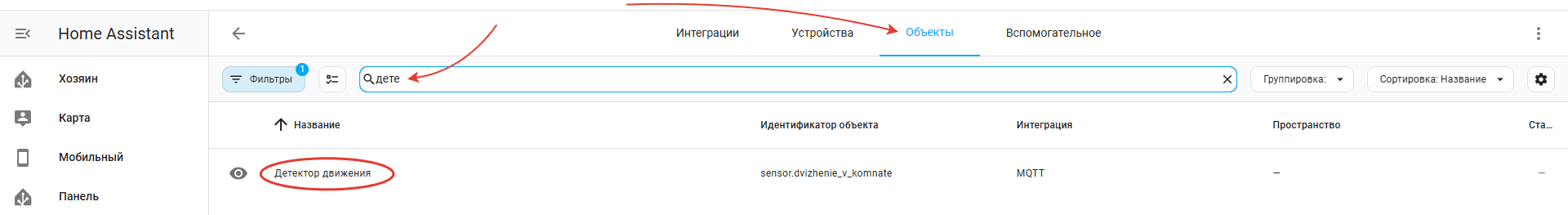 Переходим на вкладку «Объекты» и ищем среди имеющихся объектов «Детектор движения». Видим, что он у нас в Home Assistant присутствует. Причём именно с тем названием, которое мы задали в проекте при добавлении канала устройства.